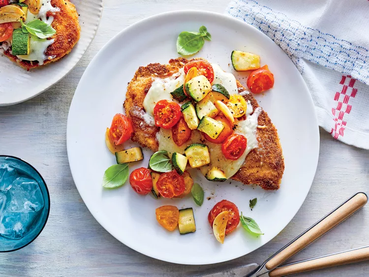 Skip canned tomatoes and serve these crispy, cheesy chicken cutlets with a fresh tomato-and-zucchini sauté...