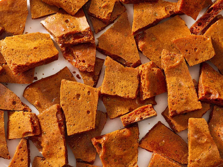 For carrot honeycomb toffee, fresh carrot juice, honey, and sugar are cooked to the hard...