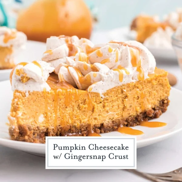Traditional pumpkin cheesecake topped with salty pumpkin seeds and pumpkin spiced whipped cream.