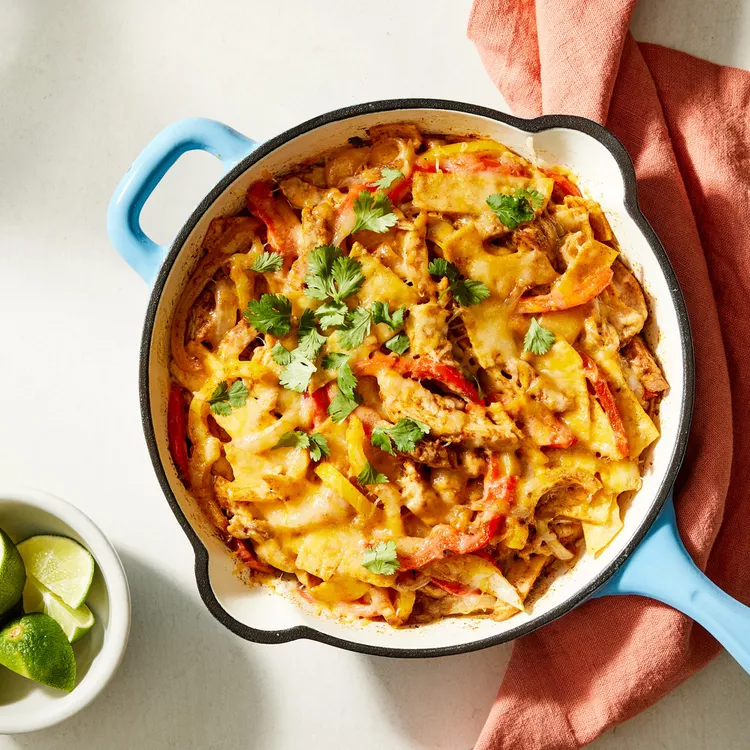 This chicken fajita casserole combines classic fajita veggies and chicken thighs with corn tortillas and...
