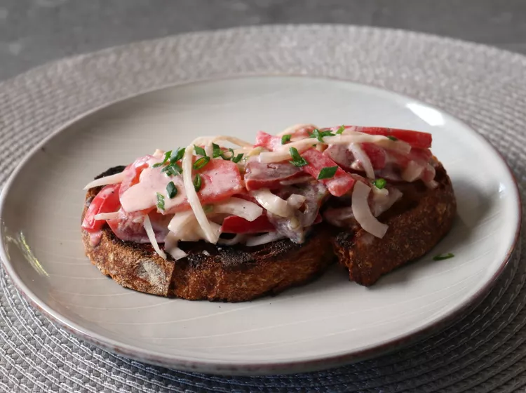 Paired with sweet onions, dressed with a simple, tangy, creamy sauce, and served on charred...