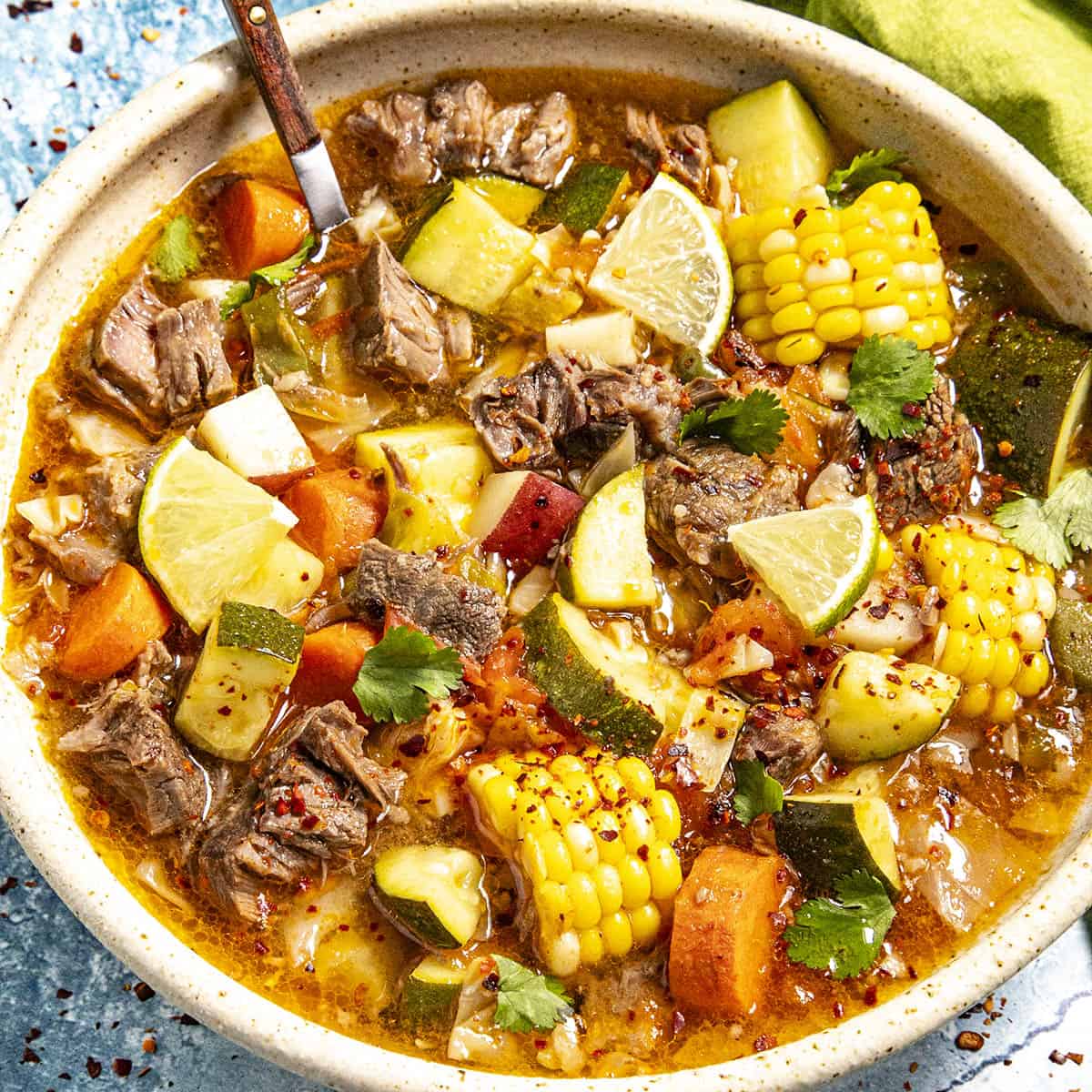 Traditional Mexican beef soup with short ribs or stew meat, corn, potatoes, and vegetables. Light...