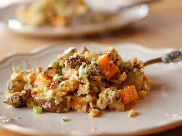 Meat and Potato Scramble is a hearty breakfast dish combining scrambled eggs with cooked potatoes...