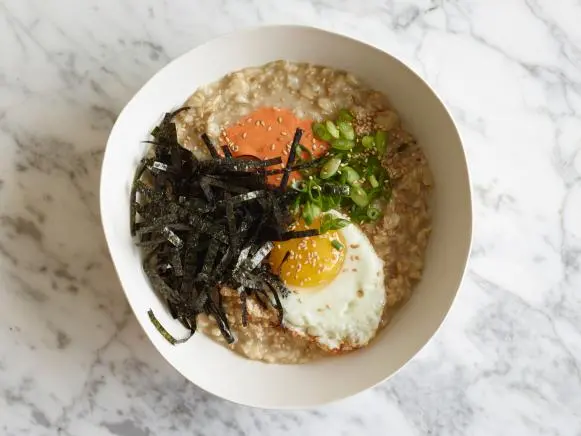 If you've never tried savory oatmeal, then start here. Chicken broth, fried egg and sesame...