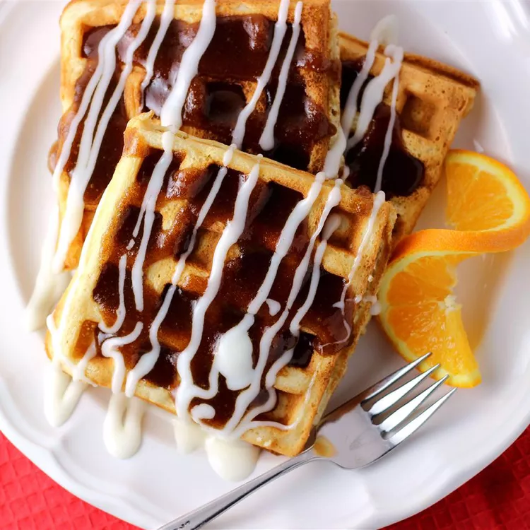 These cinnamon roll waffles with a sweet cream cheese topping taste just like a cinnamon roll! Serve with bacon to help contrast the...