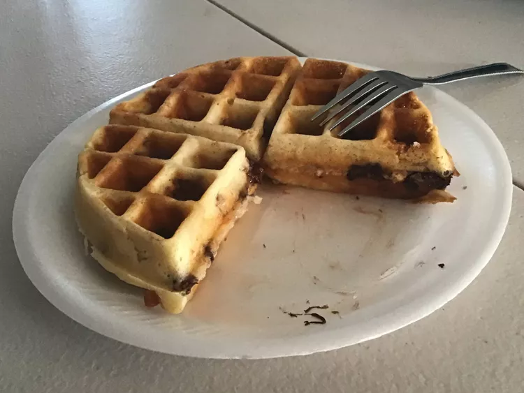 This recipe yields the fluffiest Belgian waffles with melty chocolate chips on the inside.