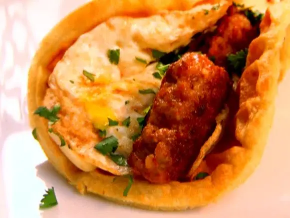 Egg and Sausage Waffle Wrap is a handheld breakfast featuring a cooked egg and savory...