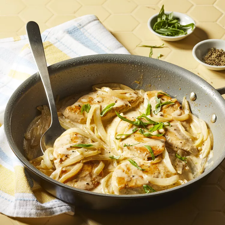 This one-skillet dinner combines quick-cooking chicken cutlets with a creamy sauce of sliced onion and...