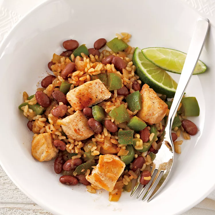Fiber-rich red beans, whole-grain brown rice and skillet-cooked chicken breast are ready in just 20...
