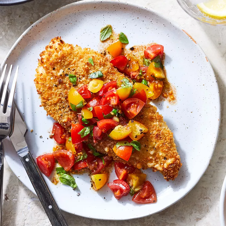 A fresh tomato-and-basil topping on panko-crusted chicken cutlets makes an easy meal for family or...
