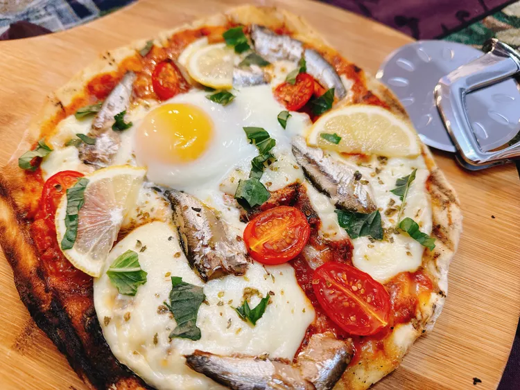 This sardine pizza showcases the vibrant flavors of the Mediterranean. With sardines, fresh mozzarella, tomatoes,...