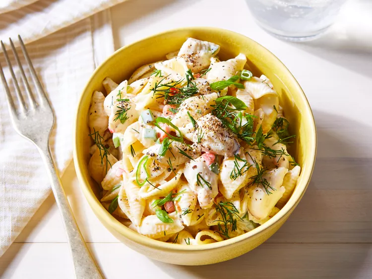 Crab pasta salad tossed with a creamy, seasoned sauce and served chilled.