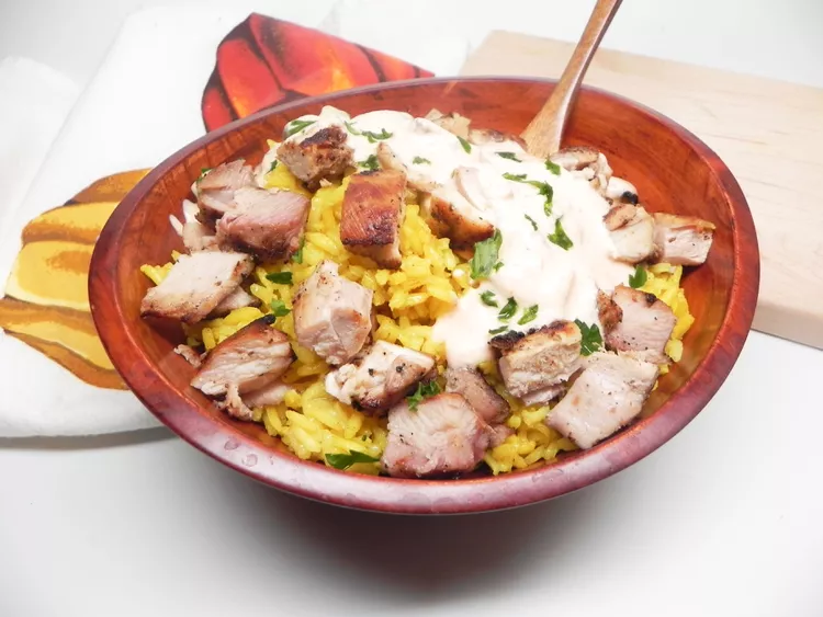Halal cart chicken is boldly spiced and served with fragrant turmeric rice and spicy yogurt...