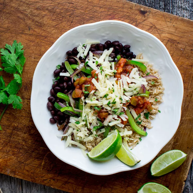 Simple brown rice and black beans serve as the backdrop for sautéed veggies and taco...