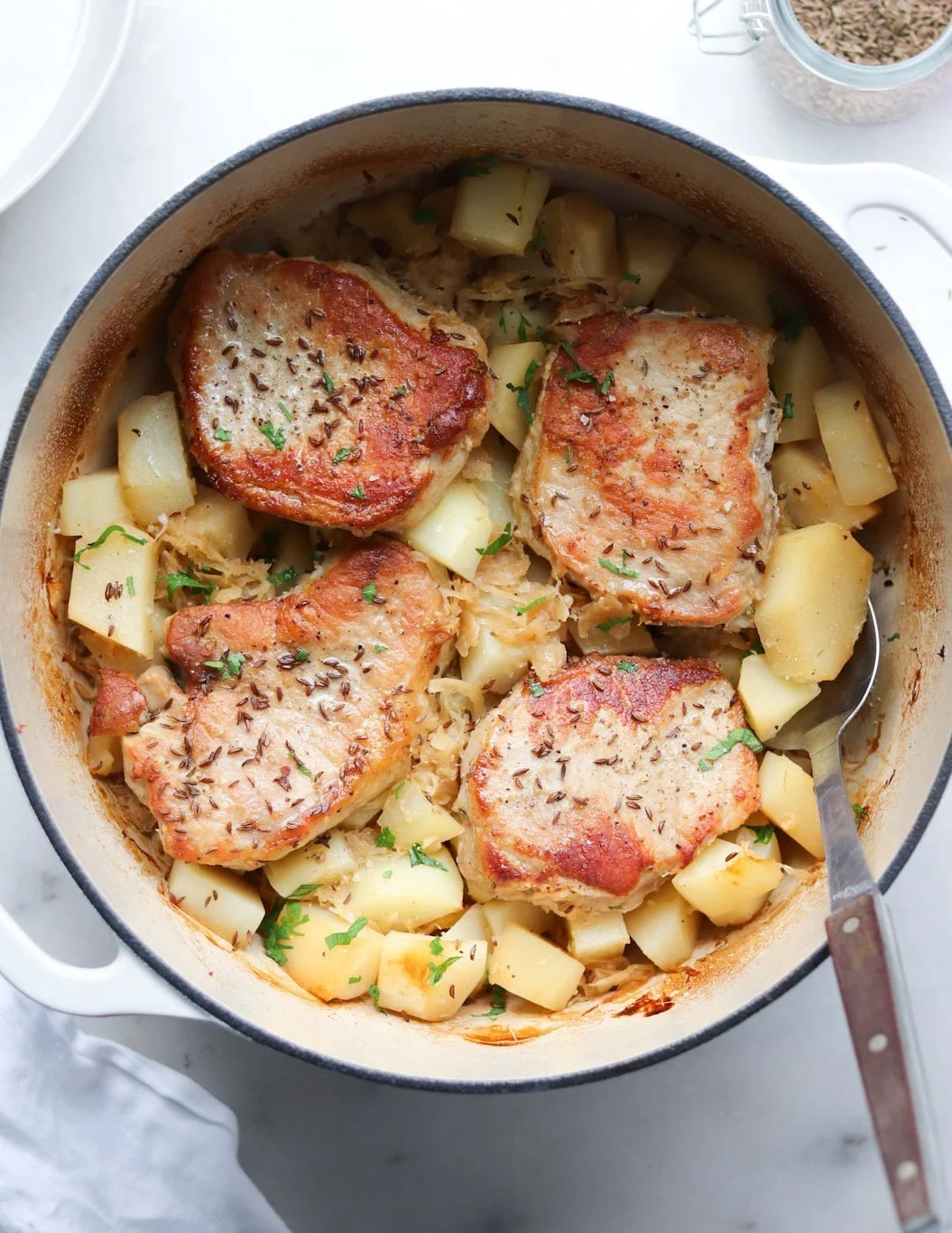 A classic pairing of pork chops and tangy sauerkraut, slow-cooked or baked together for old-world...