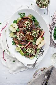 Smoky mesquite-grilled pork chops topped with a fresh apple salsa for a sweet, spicy, and savory bite.