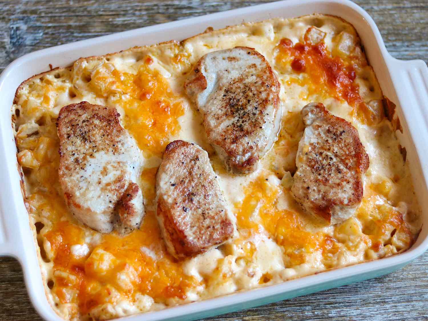 Tender pork chops layered with sliced potatoes and creamy sauce, then baked until golden. A...