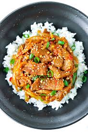 Thin pork slices flash-cooked with vegetables in a hot wok, coated in a spicy sauce—quick,...