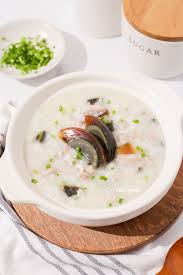 A traditional Chinese rice porridge with tender pork and preserved century eggs, offering a creamy...