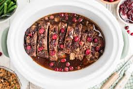 Pork roast slow-cooked with tart cranberries, onions, and spices for a sweet and savory dish...