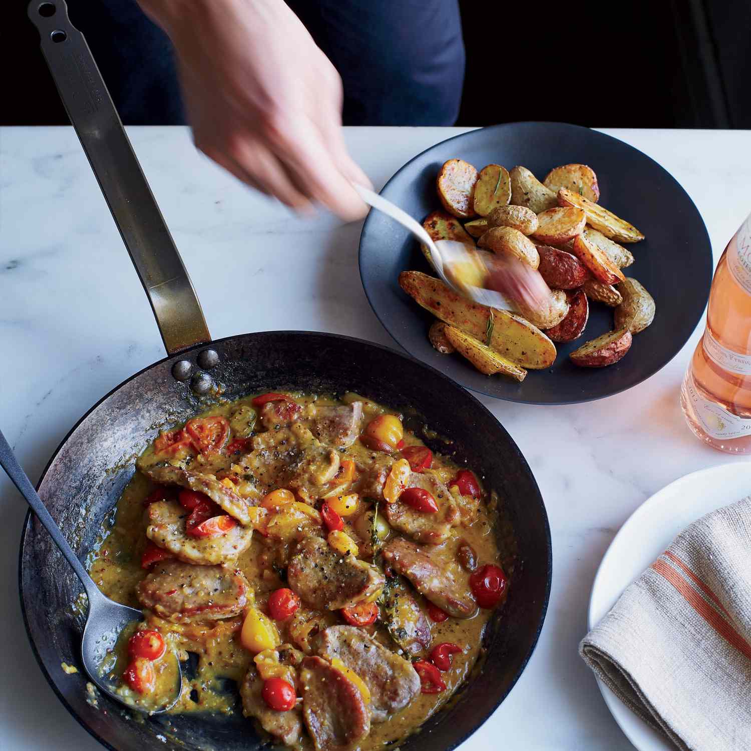 A classic family-style pork chop dinner with potatoes and vegetables—full of nostalgic flavors and cozy simplicity.