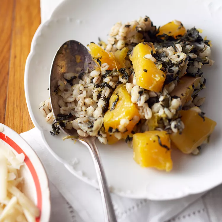 Barley is an excellent source of fiber, and in this slow-cooker recipe it's paired with...