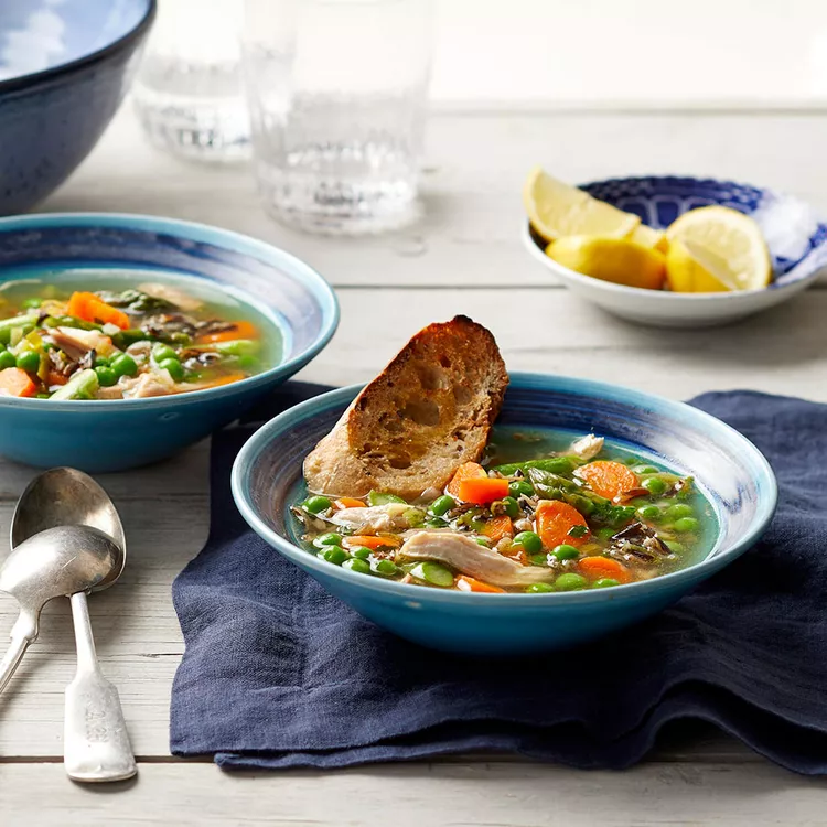 Slow Cooker Chicken & Wild Rice Soup with Asparagus & Peas